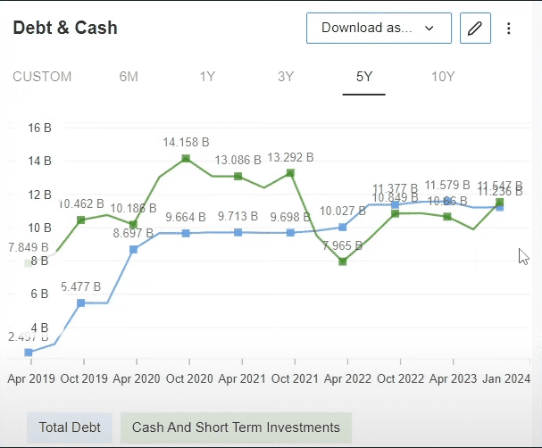 Vamos a ver ahora la deuda y el efectivo para ver si se endeudó mucho y está al borde de la quiebra.