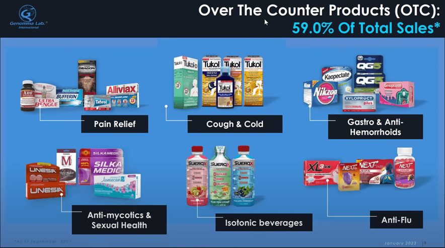 Y las marcas más fuertes nos ponen que son Asepxia, Cicatricure, Suerox, Tio Nacho, Tafirol, Novamil, Groomen, Goicochea, XL-3, Alliviax, Nikson, Lomecan, Unesia, Vanart, entre otras.