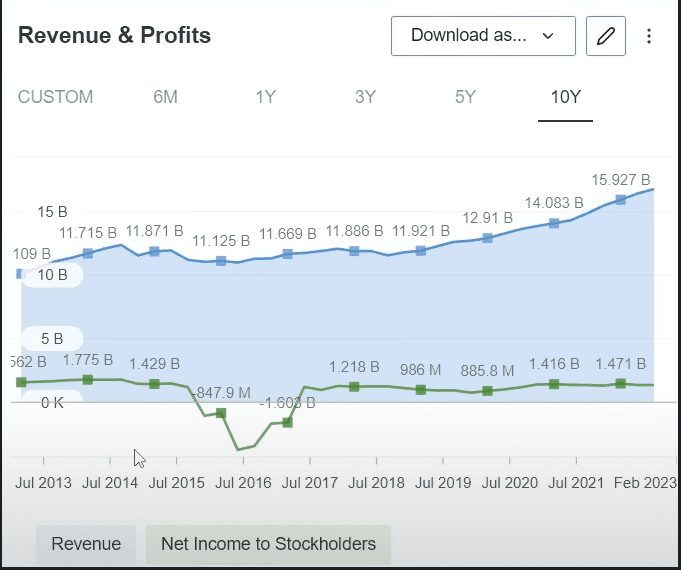 Este es su histórico de 10 años, las ventas es la línea azul y las ganancias es la línea verde.