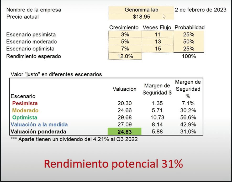 Esto es en el peor caso, en caso moderado deberíamos comprarla en $24 pesos y en el caso optimista en $29 pesos.