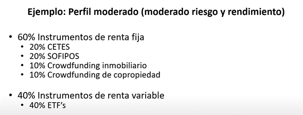 Ahora, si tú dices tener un perfil moderado y tal vez quieres correr un poco de riesgo y ganar un poco más de rendimiento puedes hacerlo un 60% en renta fija y 40% en instrumentos de renta variable.