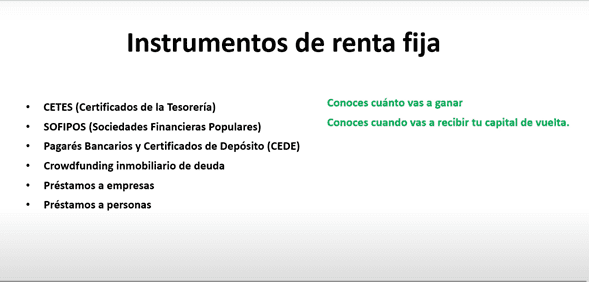 Como CETES, pagarés bancarios, SOFIPOS, fondeo colectivo inmobiliario de deuda, etc.