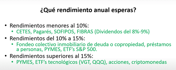 Te comparto una imagen con los instrumentos en los que puedes invertir dependiendo el rendimiento anual que esperas.