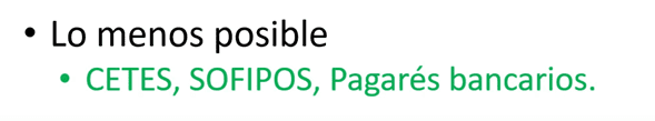 Como CETES que paga un 5.5% al año, SOFIPOS que llegan a pagar hasta 10% anual y pagarés bancarios que casi están como CETES con un 5.5%.