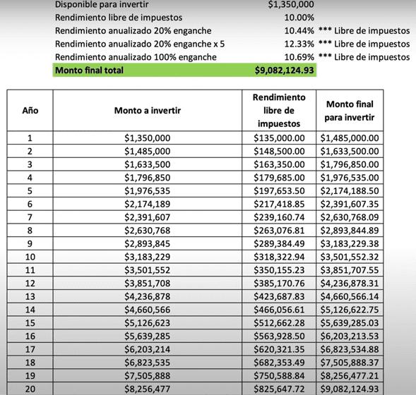 Ahorita hablamos de las conclusiones, estos solo son los números y con el ejercicio de los 1.35 millones de pesos después de los 20 años terminas con 9 millones.