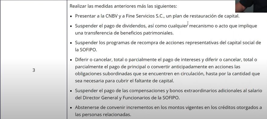 También deben suspender el pago de dividendos, suspender la recompra de acciones, diferir a cancelar total o parcialmente el pago de intereses, suspender el pago de las compensaciones y bonos extraordinarios del director general y funcionarios de la SOFIPO.