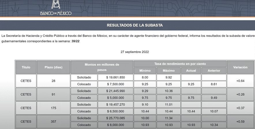 El día que me di cuenta del aumento de tasas en esta SOFIPO, también fue la subasta de valores de Banco de México, fue el martes 27 de septiembre de 2022.