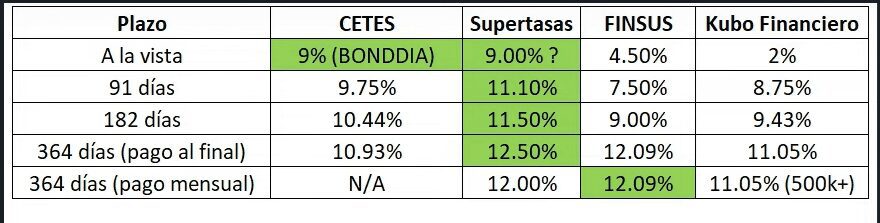 Luego, a un plazo de 1 año con pago al final, cetes paga el 10.93%, Supertasas el 12.5%, Finsus el 12.09% y Kubo el 11.05%.