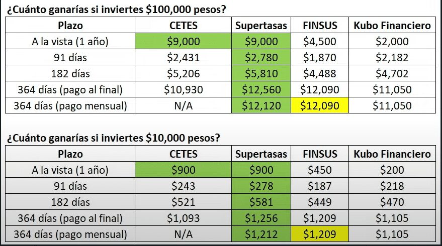 Si tú inviertes $100,000 pesos a la vista a un año en cetes te pagarían $9,000 pesos, en Supertasas ganarías lo mismo $9,000 pesos, en Finsus $4,500 pesos y en Kubo Financiero $2,000 pesos.
