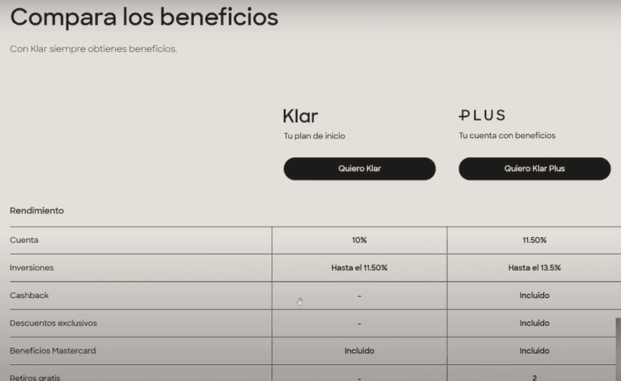 Te da cashback por las compras que realizas con frecuencia y te da mejores rendimientos que ya que te vas a poder convertir en Klar Plus.