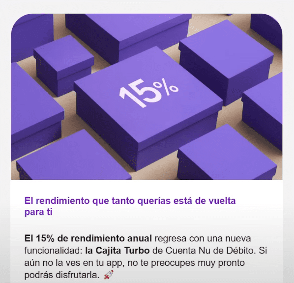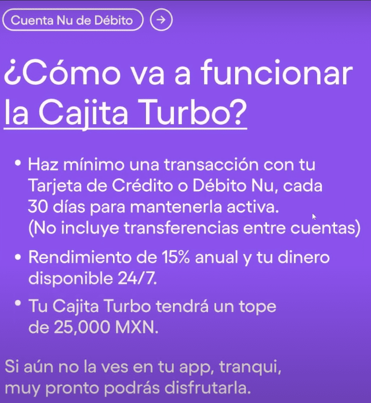 La SOFIPO Nu acaba de anunciar un nuevo producto llamado la «cajita turbo» que ofrece rendimientos del 15% anual con bastantes limitantes.