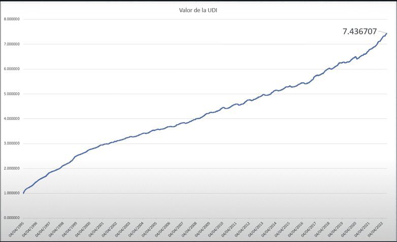 Te voy a mostrar el gráfico histórico de 1995 a 2022 del precio de la UDI.