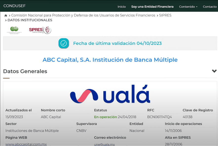 Si tu lo buscas en el SIPRES de la CONDUSEF efectivamente ABC Capital es un banco regulado en México, todo se ve en orden.