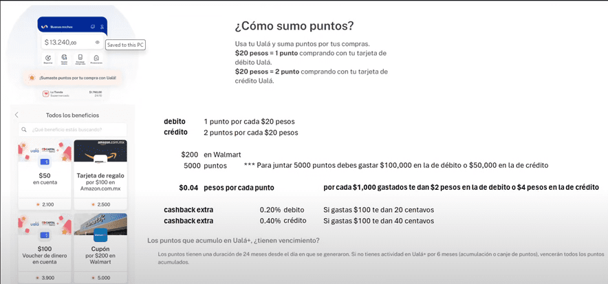 Dice que por cada $20 pesos que gastes con tu tarjeta de débito te dan 1 punto o por cada $20 pesos que gastes con tu tarjeta de crédito te dan 2 puntos.
