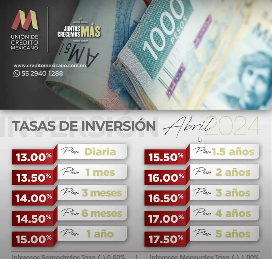 Esta nota la estoy haciendo porque si tú ves la página de Facebook de unión de crédito mexicano vienen las siguientes tasas que ofrecían a abril de 2024.