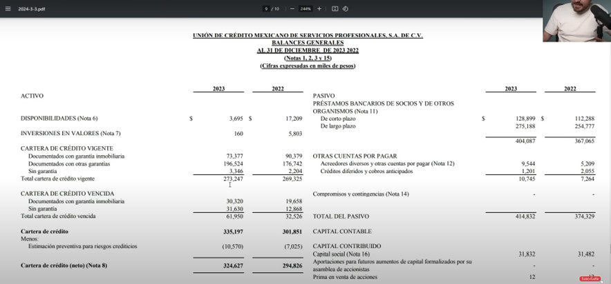 En total de cartera vigente en 2023 eran $273 millones de pesos, pero la cartera vencida en ese mismo período era de $61 millones de pesos.